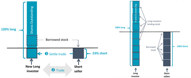 Short positions can only be established when they trade with a buyer. The buyers are increasing long exposure at the same rate that short sellers are increasing exposure, if a stock is 100% short then there is an equal amount of additional long exposure on the other side. 1